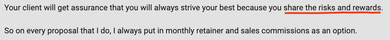 If you go for a commission-based model with a client who’s just starting out—no validated offer, no potential customers, and zero sales…